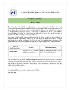 Финансовый регулятор Белиза «Комиссия по международным финансовым услугам» (IFSC) опубликовал предупреждение о незаконной деятельности компании Thomas Smith, фактически признав данную компанию мошеннической структурой, целью которой являлось завладение средствами потенциальных вкладчиков.