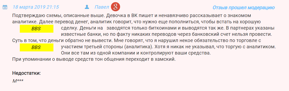 Отзывов о BBSFOREX поканемного, но характер отзывов подтверждает, что компания мошенническая и доверять деньги этом псевдоброкеру не стоит.