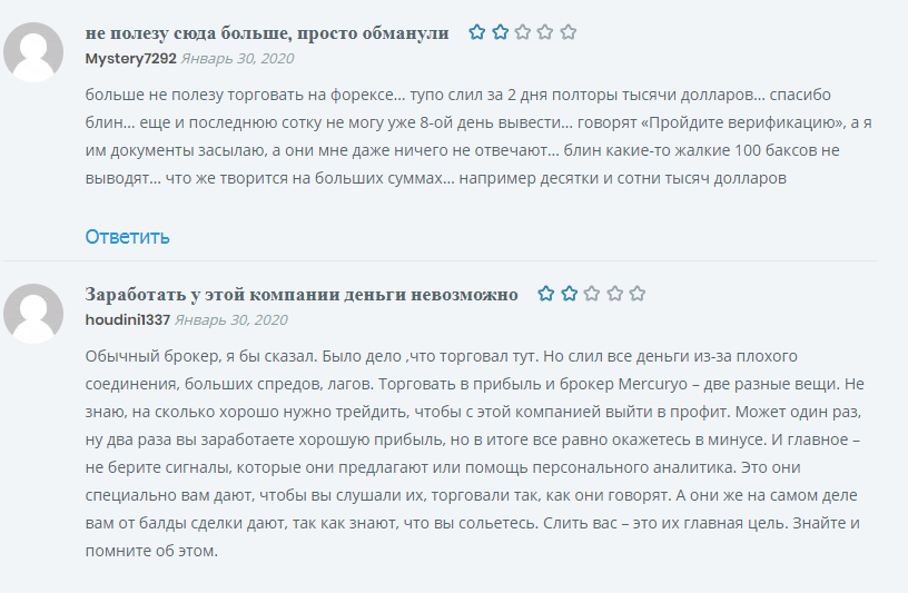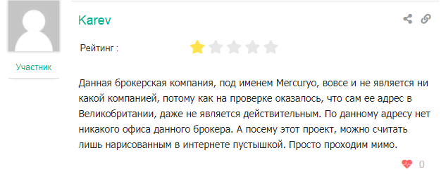 Реальные отзывы о Mercuryo подтверждают факт того, что Mercuryo Invest LTD это типичная мошенническая компания. Также на различных тематических сайтах очень много проплаченных хвалебных отзывов, воспринимать которые всерьез нельзя. Реальные клиенты лжеброкера пишут о нем далеко нелестные вещи: