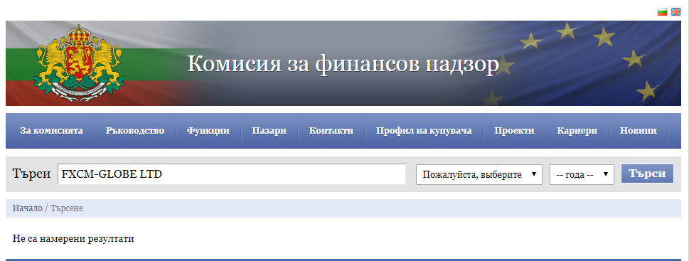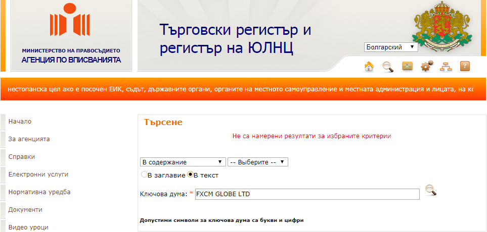 Однако на сайте министерства юстиции Болгарии организация FXCM-GLOBE LTD не числится. Никаких результатов не просматривается и по запросам на реестровые номера якобы присвоенные этой компании: