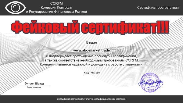 В блоке с документами на сайте ABC-Market размещен сертификат псевдорегулятора под названием «Комиссия контроля и регулирования финансовых рынков» (CCRFM). Ранее мы уже рассказывали об этом фейковом псевдорегуляторе, продающем ничего не значащие писульки различным мошенническим конторам. Подобный «сертификат» железобетонное подтверждение тому, что вы имеете дело с лохотроном. Ни одна приличная компания с жуликами типа CCRFM или ЦРОФР иметь не будет, это негативно скажется на репутации. Но туповатые мошенники из ABC-Market этого, видимо, не понимают, да и за репутацию им можно не беспокоиться — ее у них просто нет.