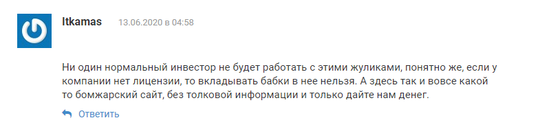 Еще один пользователь с логином Itkamas считает что любой нормальный инвестор сразу же поймет, что это лохотрон, так как на сайте нет никаких лицензий и сам сайт слишком дешевый: