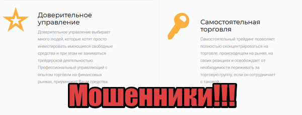 Также посетителям сайта жулики предлагают отдать деньги в доверительное управление. Опять же, никаких деталей не указано: какая доходность, какие риски, на каких рынках будет вестись торговаля и т.д. На практике аферисты просто предоставят своего «профессионального» управляющего, который в миг сольет все деньги инвестора.