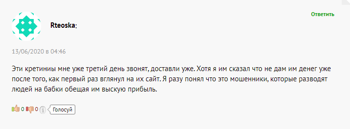Например, пользователь Rteoska пишет о том, что жулики звонят ему и предлагают вложить деньги в платформу ABC-Market, хотя он с первого взгляда на сайт понял, что это лохотрон: