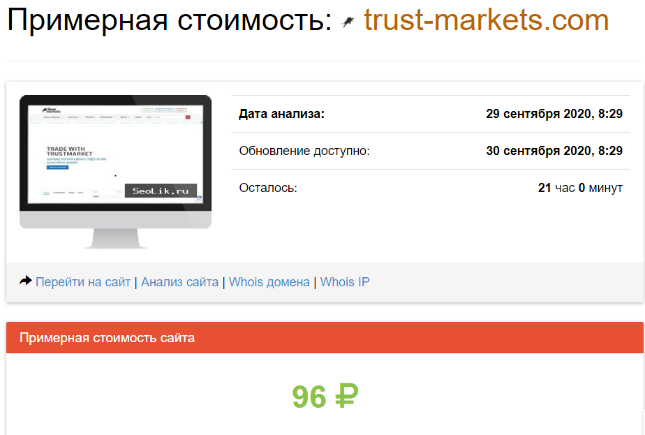 Специализированный сервис оценил сайт trust-markets.com в менее чем полтора доллара США. Этого достаточно, чтобы понять с кем мы имеем дело.