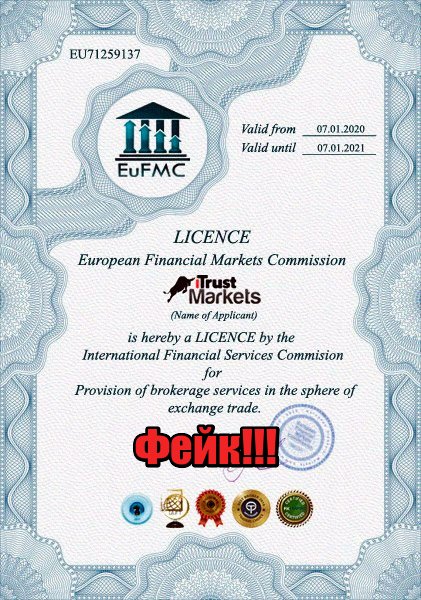 В разделе «РЕГУЛИРОВАНИЕ» шарлатаны из Trust Markets разместили лицензию № EU71259137 от несуществующего регулятора — Комиссии по финансовым услугам – EUFMC (European Financial Markets Commission). По легенде жуликов данный европейский регулятор прописан почему-то в Новой Зеландии по адресу: Веллингтон 6011, Уиллис-стрит 88/100. Сайт этой фейковой структуры откровенная дешёвка и липа, также как и выданные ей сертификаты.