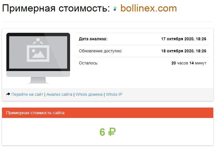 Первое, на что стоит обратить внимание, это на качество сайта. В нашем случае видно, что жулики особо не заморачивались по этому поводу. Официальный сайт Bollinex больше похож на дешевенький лендинг, сделанный новичком-фрилансером, чем на главный ресурс серьезной финансовой организации. Это недоразумение было оценено специализированным сервисом аж в 6 рублей: