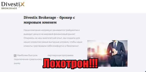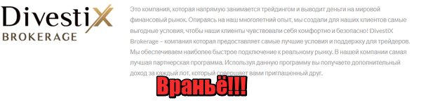 Divestix Brokerage (divestixbrokerage.com) заявляет о себе, как о «брокере с мировым именем», который предоставлении услуги по торговле на финансовых рынках. Контора хвастается многолетним опытом работы и предлагает возможность получения пассивного дополнительного дохода. Новичков и опытных пользователей обещают обучить трейдингу. Все это смотрится смотрятся заманчиво, однако ряд негативных моментов указывает на то, что от сотрудничества с этой компанией лучше воздержаться. Давайте разбираться, можно ли верить обещаниям «брокера» и какова вероятность того что здесь реально помогут заработать?