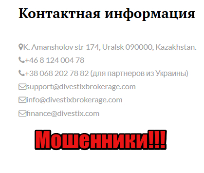 В качестве контактов на сайте divestixbrokerage.com указан адрес (Казахстан, Западно-Казахстанская область, УРАЛЬСК Г.А.,Г.УРАЛЬСК, УЛИЦА Қ.АМАНЖОЛОВ, 174), два телефона (+46812400478, +380682027882) и три мейла: