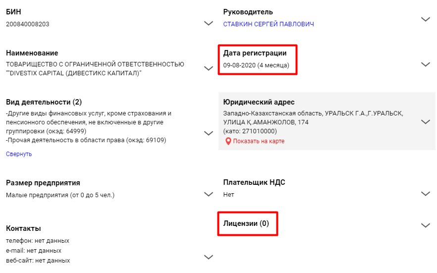 Проверка юридических лиц Казахстана показала, что товарищество с ограниченной ответственностью «DIVESTIX CAPITAL (ДИВЕСТИКС КАПИТАЛ)» (№ 200840008203) действительно существует. Дата регистрации компании 09 августа 2020 года. Лоховозке всего 4 месяца. Руководитель организации некий СТАВКИН СЕРГЕЙ ПАВЛОВИЧ. Довольно знаковая фамилия.