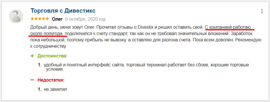 Персонаж под ником Олег утверждает, что торгует с Дивестикс полгода, однако в то время данного проекта еще не существовало. Подобные вау!-отзывы сами же мошенники и пишут.