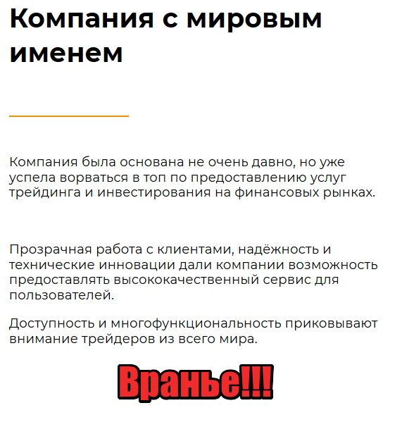 Сайт лохоброкера ничем не отличается от ресурсов аналогичных лохотронов. Все банально: куча недостоверной рекламы, липовых достоинств и, конечно же, призывы открыть торговый счет. Компания делает упор на привлечение новичков, обещая научить их прибыльному трейдингу. При этом в разделе «Обучение» ничего, кроме «воды», нет. Представленные материалы не имеют никакой практической ценности. Тактика жуликов проста: под прикрытием образовательных курсов из горе-трейдера выкачиваются деньги на пополнение счета. В дальнейшем, в процессе торгов баланс обнуляют.