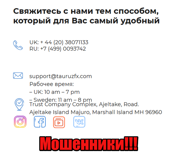 В списке контактов TauruzFx указан мейл ([email protected]) и несколько телефонных номеров: