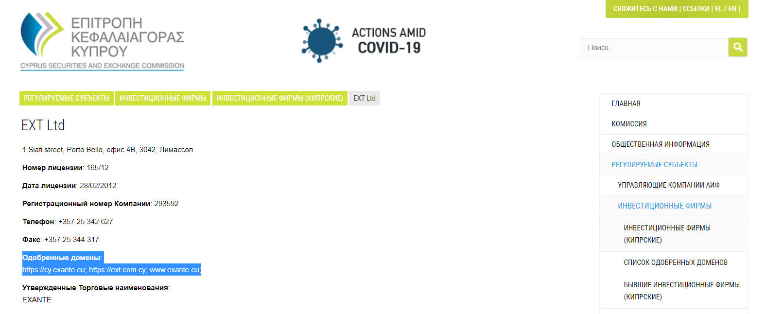 Среди одобренных доменов (https://cy.exante.eu; https://ext.com.cy; www.exante.eu) домен richinvestgroup.com не значится. Жулики попросту прикрываются чужой лицензией!