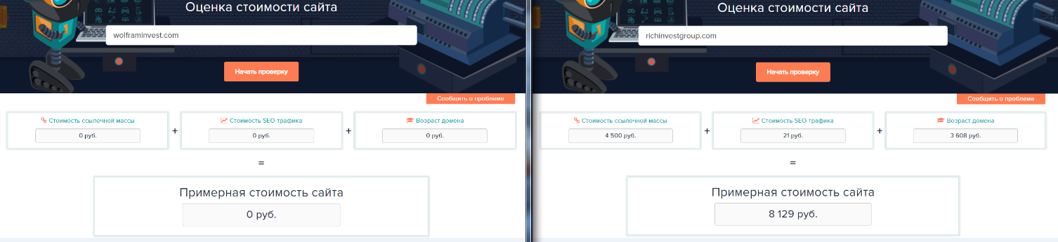 По оценке специализированного сервиса стоимость richinvestgroup.com едва перевалила за 100$, и то благодаря цене домена. Wolframinvest.com был оценен в полновесные ноль рублей! Все это косвенным образом указывает на истинный уровень этих мутных лоховозок.