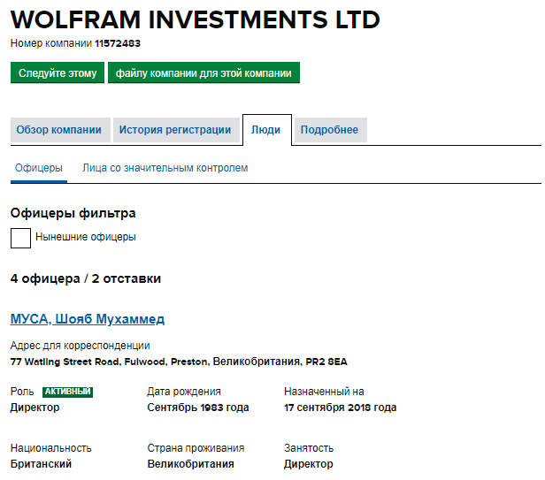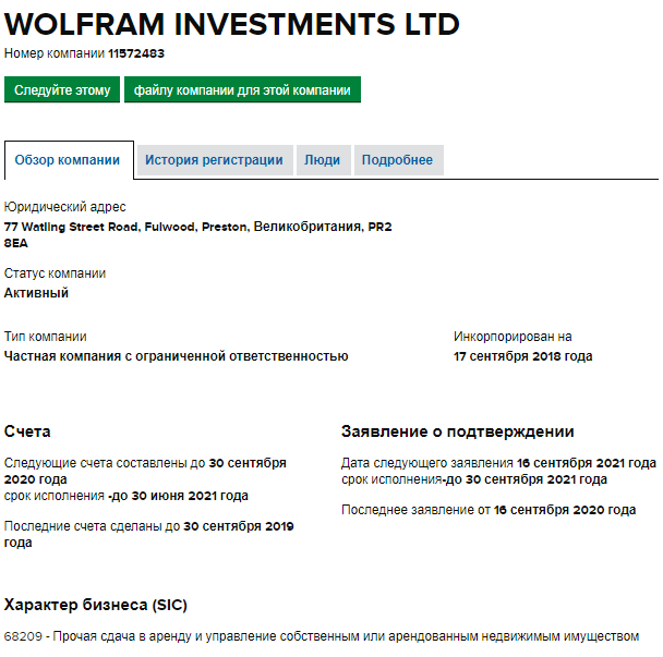 По легенде хедж фонд WolframInvest принадлежит Компании WOLFRAM INVESTMENTS LTD (№ 11572483) которая была зарегистрирована 17 сентября 2018 года по адресу: UNITED KINGDOM, PRESTON, 77 WATLING STREET ROAD, FULWOOD, PR2 8EA.