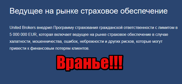 Жулики из United Brokers даже придумали сказку о страховом обеспечении. По легенде «Программа страхования гражданской ответственности» с лимитом в 5 000 000 EUR обязательно покроет финансовые потери клиентов в случае халатности, мошенничества, ошибок, небрежности и прочих рисков. Конечно же, это вранье. Как только вы переводите жуликам деньги, о возврате можете даже не мечтать.