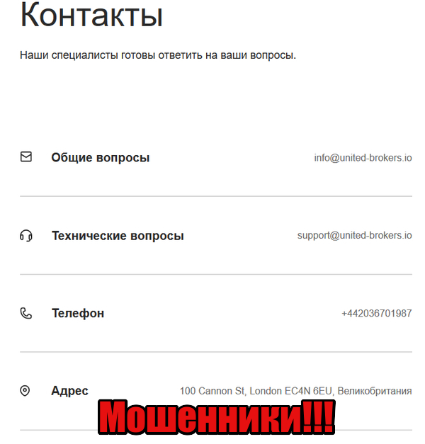 - Адрес: 100 Cannon St, London EC4N 6EU, Великобритания. Псевдоброкер не имеет права предоставлять услуги на территории Британии. Никаких офисов в этой стране у жуликов нет, адрес фейковый.