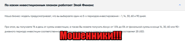 В разделе FAQ можно ознакомиться с «инвестиционными планами» Элай Финанс. Минимальный депозит — 25 USD. Вся инвестиционная работа якобы будет проводиться специалистами компании, имена которых простому обывателю знать не положено. Вкладчик выбирает один из пяти временных периодов инвестирования: 1, 14, 30, 60 и 90 дней. Инвестору обещан ежедневный доход равный 1% (!!!) в день от суммы депонирования. В конце срока клиент может получить бонус в размере 1.5% до 5% от финальной суммы. Что смущает в этой истории? Указанная сверхприбыль. Редкие банки предлагают 2-3% в год. В нашем случае мошенники обещают аж 365% годовых! Такой фантастический доход попросту невозможно получить, работая на законных основаниях.