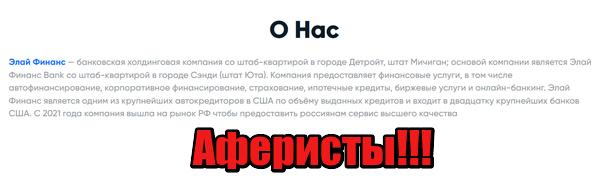 Официальный сайт шарлатанов из Элай Финанс — это ничем не примечательный ресурс, который и близко не похож на нечто стоящее. Порядочная и надежная финансовая компания по определению не может владеть низкобюджетной пустышкой.