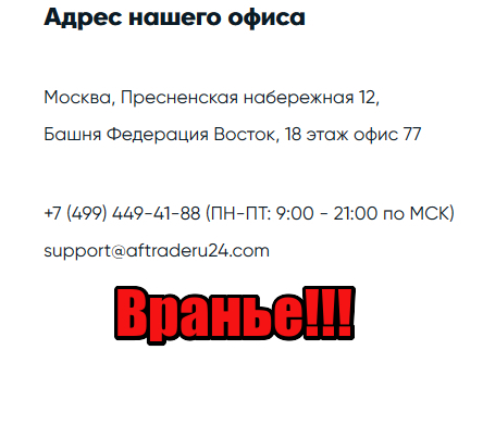 - Адрес: Москва, Пресненская набережная 12, Башня Федерация Восток, 18 этаж офис 77. Никакого офиса «брокера» там, конечно же, нет. Данную локацию очень любят упоминать различные финансовые аферисты.