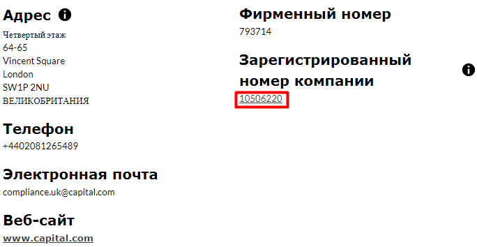 На самом деле под номером 10506220 зарегистрирована компания CAPITAL COM (UK) LIMITED, которая не имеет никакого отношения к нашим аферистам. Данная организация на самом деле имеет лицензию, выданную местным Управлением по финансовому регулированию и надзору (Financial Conduct Authority). Но, как видим, ни телефон: +4402081265489, ни электронная почта: [email protected] ни веб-сайт: www.capital.com не совпадают с указанными данными на сайте проходимцев.