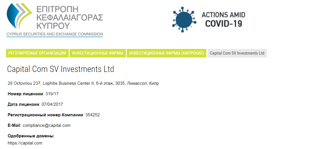 Под регистрационном номером 354252 на Кипре зарегистрирована компания Capital Com SV Investments Lt. Лицензия № 319/17 от кипрской Комиссии по ценным бумагам и биржам была выдана именно этой организации. В списке одобренных доменов: значится capital.com. Что общего между Элай Финанс и Капитал Ком? Правильный ответ – ничего!