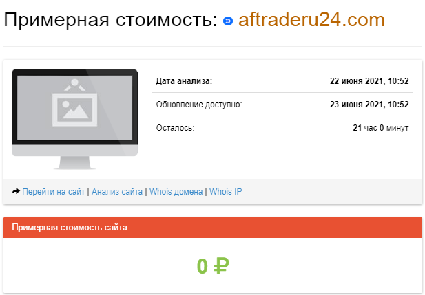 Специализированный сервис оценил старания разработчиков aftraderu24.com в ноль рублей! Жулики явно не рассчитывают на долгосрочную перспективу, поэтому не видят особых оснований, чтобы вкладываться в создание и продвижение своего главного вебресурса.