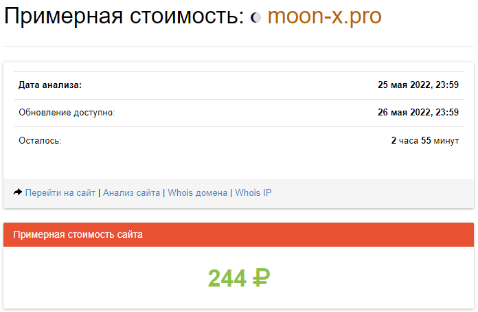 Специализированный сервис оценил moon-x.pro примерно в 4 $. Очевидно, что перед нами типичная низкопробная фальшивка.