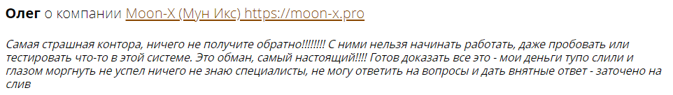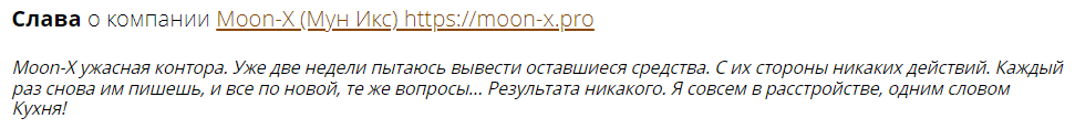MOON-X (moon-x.pro) – работает незаконно, скрывает условия сотрудничества и вводит посетителей в заблуждение относительно трудового стажа. Деньги шарлатаны не выводят, что подтверждается отзывами от многочисленных облапошенных клиентов.