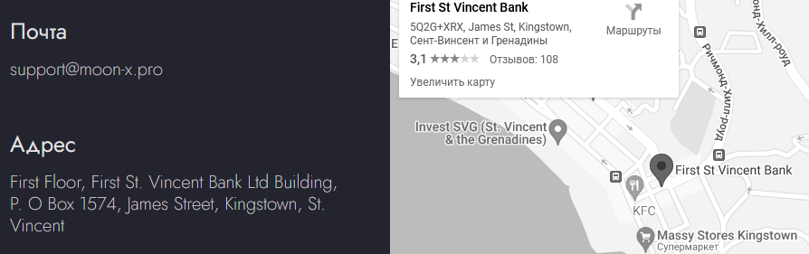 По юридической части у MOON-X также очевидные проблемы. В Пользовательском соглашении заявлено, что договор заключается между клиентом и компанией Moon Markets LLC (2113 LLC 2022), зарегистрированной якобы по адресу: First Floor, First St. Vincent Bank Ltd Building, P. O Box 1574, James Street, Kingstown, St. Vincent & the Grenadines.