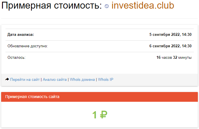 Специализированный сервис оценил investidea.club всего-навсего в 1 рубль. Уже одного этого достаточно, чтобы сделать правильные выводы.