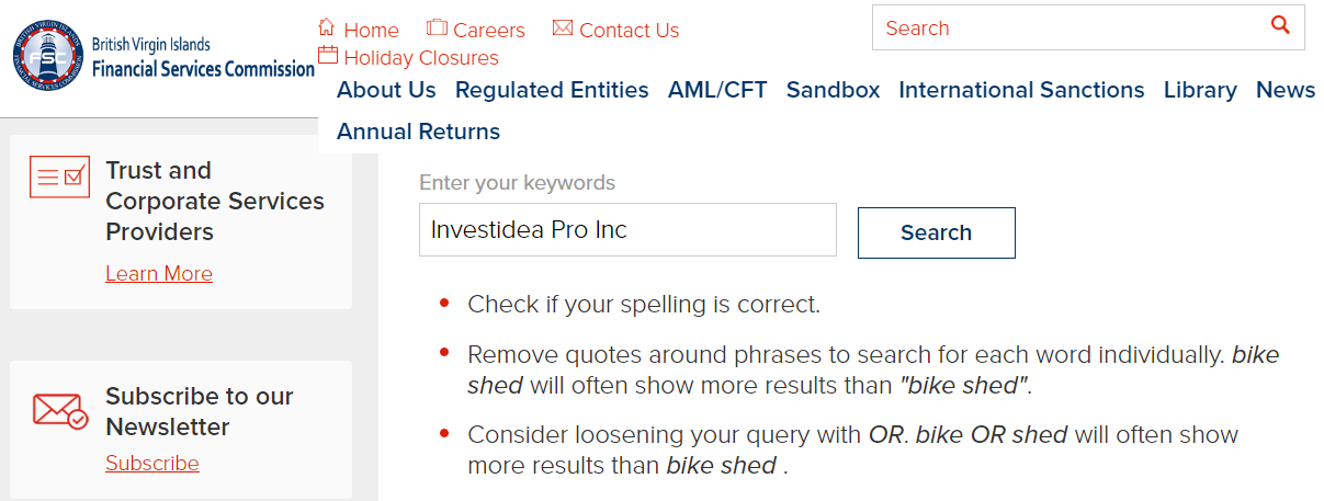 Все это, конечно же, вранье. Проверка показала, в базе данных регулятора Британских Виргинских островов (Financial Services Commission) нет никаких упоминаний о компании Investidea Pro Inc.