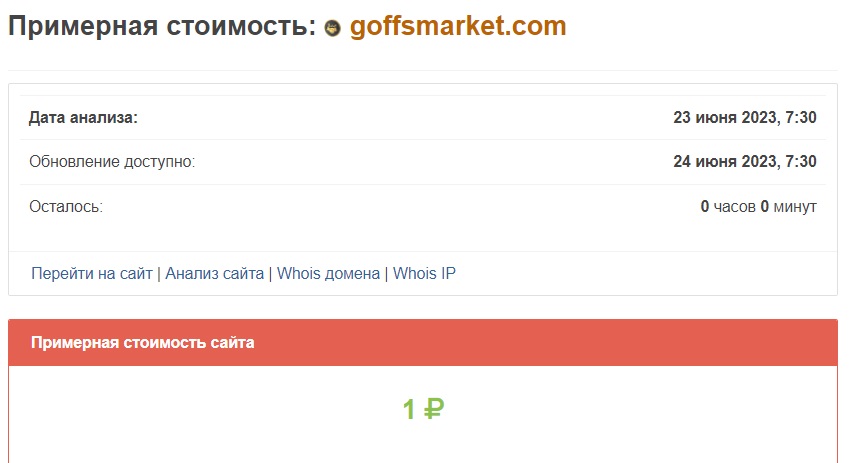 Стоимость goffsmarket.com также говорит сама за себя. По оценке специализированного сервиса стоимость сайта лохоброкера равна примерно 1 рублю. Уже одного этого достаточно, чтобы сделать правильные выводы и навсегда забыть об этой конторе.
