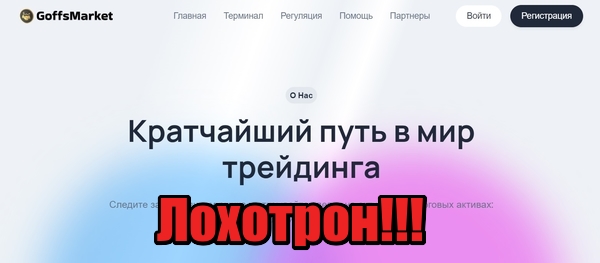 «Торговля на Goffs Market (goffsmarket.com) не требует от трейдера глубокой аналитики финансового рынка» — уверяют на сайте очередной лоховозки, изображающей из себя брокера. Если верить создателям сервиса, компания обслуживает сотни тысяч трейдеров, предоставляет выгодные торговые условия, неограниченную помощь и поддержку. Можно ли доверять этой конторе? Мы бы не советовали. Перед нами примитивный лохотрон, в котором можно только потерять деньги.