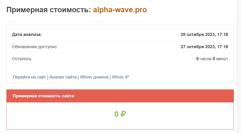 Специализированный сервис оценил стоимость alpha-wave.pro в ноль (!!!) рублей. Создатели сомнительного сервиса явно не рассчитывают на долгий срок работы, поэтому в создание этого одноразового баблосборника большие средства целенаправленно не вкладывали. Уже одного этого достаточно, чтобы сделать правильные выводы и навсегда забыть об этой лоховозке.