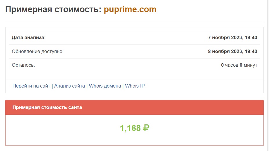 Специализированный сервис оценил старания разработчиков puprime.com в 13 долларов США. Это подороже, чем стоимость сайтов многих лохоброкеров, но явно не те деньги, которые должен стоить главный вебресурс легальной финансовой компании. В то, что перед нами сайт ведущего супер-пупер брокера, как утверждают создатели этой конторы, поверить могут только очень наивные люди. Уже одного этого достаточно, чтобы сделать правильные выводы.