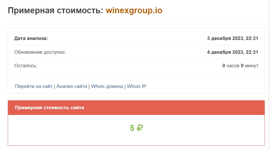 Неудивительно, что специализированный сервис оценил стоимость winexgroup.io в жалкие 5 рублей. В то, что перед нами сайт ведущей финансовой компании, ворочающей миллионами, поверить могут только очень наивные люди. Уже одного этого достаточно, чтобы сделать правильные выводы и навсегда забыть об этой лоховозке.