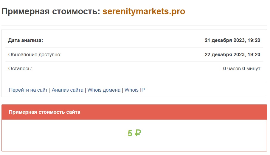 Специализированный сервис оценил стоимость serenitymarkets.pro в смешные пять рублей. В то, что перед нами сайт ведущей финансовой компании, ворочающей миллионами, поверить могут только очень наивные люди. Уже одного этого достаточно, чтобы сделать правильные выводы.