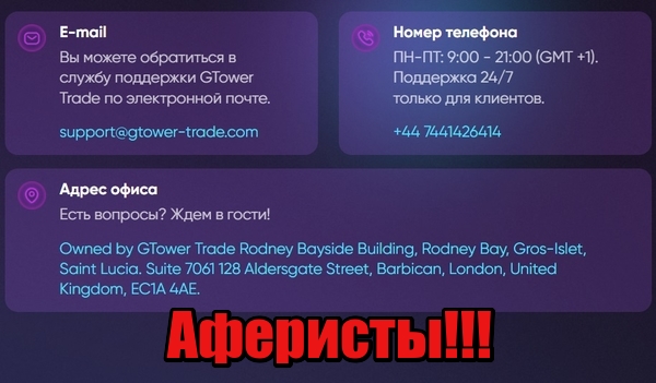 - Адрес: Owned by GTower Trade Rodney Bayside Building, Rodney Bay, Gros-Islet, Saint Lucia. Suite 7061 128 Aldersgate Street, Barbican, London, United Kingdom, EC1A 4AE