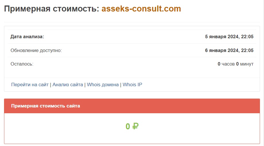 Специализированный сервис оценил стоимость asseks-consult.com в ноль (!!!) рублей. Наивно думать, что за подобной пустышкой может стоять легально действующий брокер. Уже одного этого достаточно, чтобы сделать правильные выводы и навсегда забыть про эту лоховозку. Жулики прекрасно знают, что срок жизни подобных лохотронов крайне недолог и в ближайшем будущем от сайта придется избавляться. Аферисты банально не видят смысла вкладываться в продвижение мошеннических ресурсов.