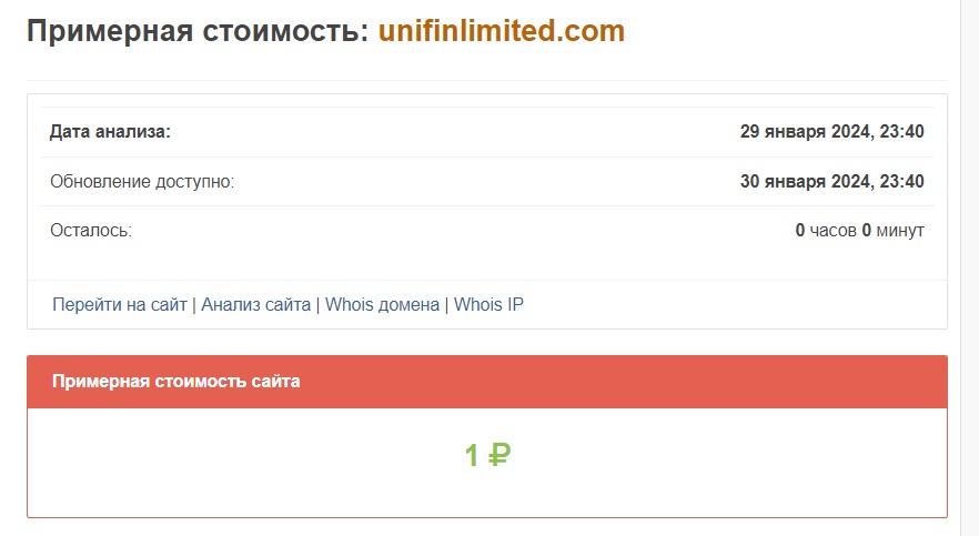Специализированный сервис по оценке сайтов оценил старания разработчиков unifinlimited.com в один рубль. Только очень наивный человек может поверить, что за подобной дешевкой может стоять легально действующая финансовая компания. Уже одного этого достаточно, чтобы сделать правильные выводы и навсегда забыть про эту лоховозку. Жулики прекрасно знают, что срок жизни подобных лохотронов редко превышает два-три месяца и в ближайшем будущем от сайта придется избавляться. Аферисты банально не видят смысла вкладываться в продвижение мошеннических ресурсов.