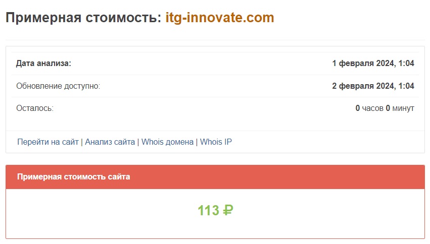 Специализированный сервис оценил стоимость itg-innovate.com в чуть больше, чем ничего. Главный веб-ресурс нашего “брокера” «потянул» всего на банку пива. Несложно догадаться, с кем мы имеем дело. Срок жизни подобных лоховозок редко превышает пару-тройку и аферисты попросту не видят смысла вкладываться в создание и продвижение сайтов своих мошеннических контор.