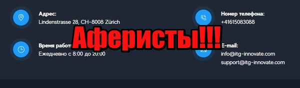 В клиентском соглашении, больше похожем на филькину грамоту, фигурирует компания ITG Innovate LTD, зарегистрированная якобы по адресу Линденштрассе 28, CH-8008 Цюрих. При этом жулики даже не заикаются про обязательную для швейцарских брокеров лицензию местной службы по надзору за финансовыми рынками (FINMA). Мы имеем дело с фейковой конторой, юридически которой вообще не существует. Деятельность этих прохвостов никто не регулирует и не контролирует. Доверять деньги анонимным мошенниками – это далеко не лучшее решение. Средства клиентов разворовываются сразу в момент поступления их на счет лохоброкера. Привлечь к ответственности неизвестных проходимцев крайне сложно.