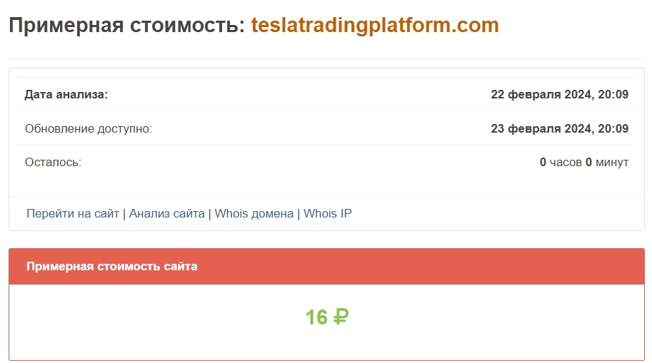 Специализированный сервис оценил стоимость teslatradingplatform.com в полновесные шестнадцать (!!!) рублей. Это явно не те деньги, которые должен стоить сайт легально действующей финансовой компании. Уровень этой шараги предельно понятен. Срок жизни подобных лохотронов редко превышает несколько месяцев. Аферисты это прекрасно понимают, и не желают тратить деньги на мошеннические сайты, которые в ближайшем будущем придется закрыть.