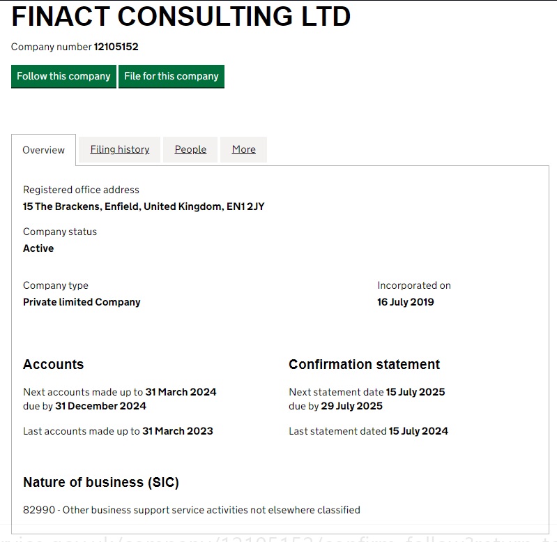 Под номером 12105152 в британском реестре юридических лиц числится компания FINACT CONSULTING LTD, основным видом деятельности которой является «прочая деятельность по оказанию услуг по поддержке бизнеса, не включенная в другие группировки». Оказывать брокерские услуги она вообще не имеет права. Лондонская фондовая биржа не является уполномоченным финансовым регулятором и не может выдавать какие-либо лицензии. Британским финансовым регулятором является The Financial Conduct Authority (FCA). Никаких разрешительных документов нашим жуликам FCA не выдавала и выдавать не могла. По факту перед нами анонимные аферисты, деятельность которых никем не регулируется и не контролируется. Добиться справедливости в суде у облапошенных клиентов не получится. Иск к фейковой компании не примет ни один суд в мире. Для клиентов это значит отсутствие даже гипотетической возможности отстаивать свои интересы в правовом поле.