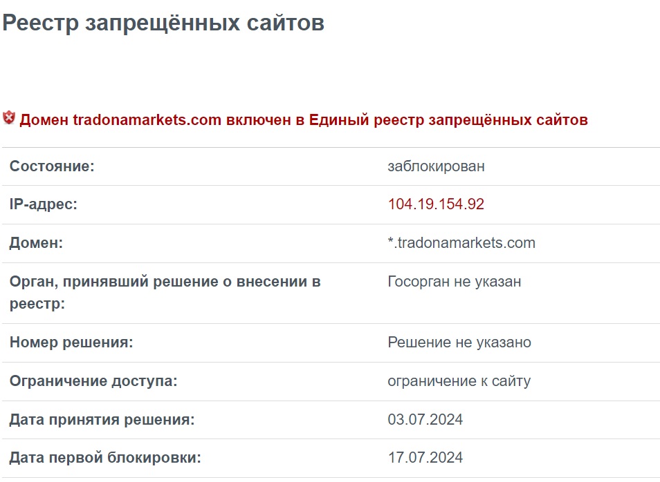 Сайт лохоброкера уже внесен в черный список на территории РФ, что подтверждает незаконную деятельность этой конторы. Tradona Markets (tradonamarkets.com) – это примитивный лохотрон, не имеющий никакого отношения к финансовым рынкам. Мошенники будут обманывать клиентов до тех пор, пока их сайт не закроют под гнетом негативных отзывов. Ради получения максимальной прибыли, создатели этой мошеннической схемы готовы пойти на любую подлость.