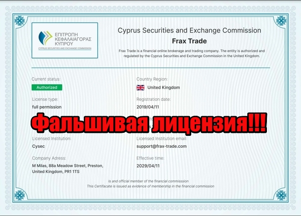 Спойлер: без всяких сомнений. Frax Trade является типичной анонимной помойкой, в которой можно только потерять деньги. Адрес, указанный на сайте лохоброкера, липовый. Свое реальное местонахождение проходимцы разглашать не станут и общаться с кинутыми клиентами в офлайне не собираются. Стремясь произвести положительное впечатление на потенциальных финансовых доноров, аферисты заявляют о наличии сразу двух лицензий и даже выложили их сканы: