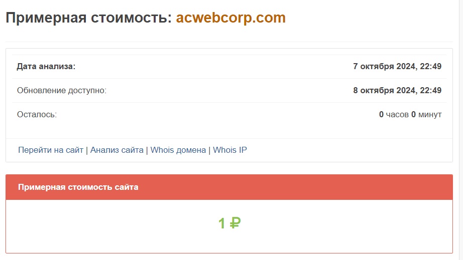 Специализированный сервис оценивают старания создателей сайта acwebcorp.com в смешные деньги. Только очень наивный человек может поверить, что за таким убогим сайтом стоит легально действующая финансовая компания. Уже этого достаточно, чтобы сделать правильные выводы и поставить жирный крест на идее работать с этой конторой. Мошенники прекрасно понимают, что срок жизни таких скам-проектов крайне короток, и вскоре от сайта придется избавляться. Поэтому они не видят смысла вкладываться в продвижение своих вебресурсов.