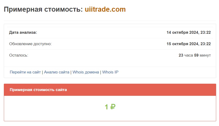 Специализированный сервис справедливо оценил старания разработчиков uiitrade.com в один (!!!) рубль. И это явно не те деньги, которые должен стоит сайт приличной финансовой компании.